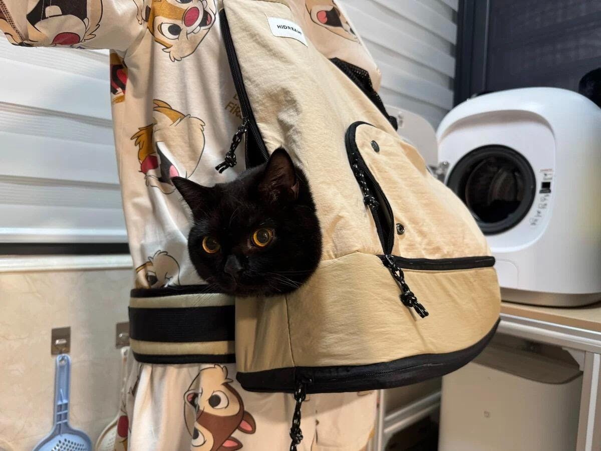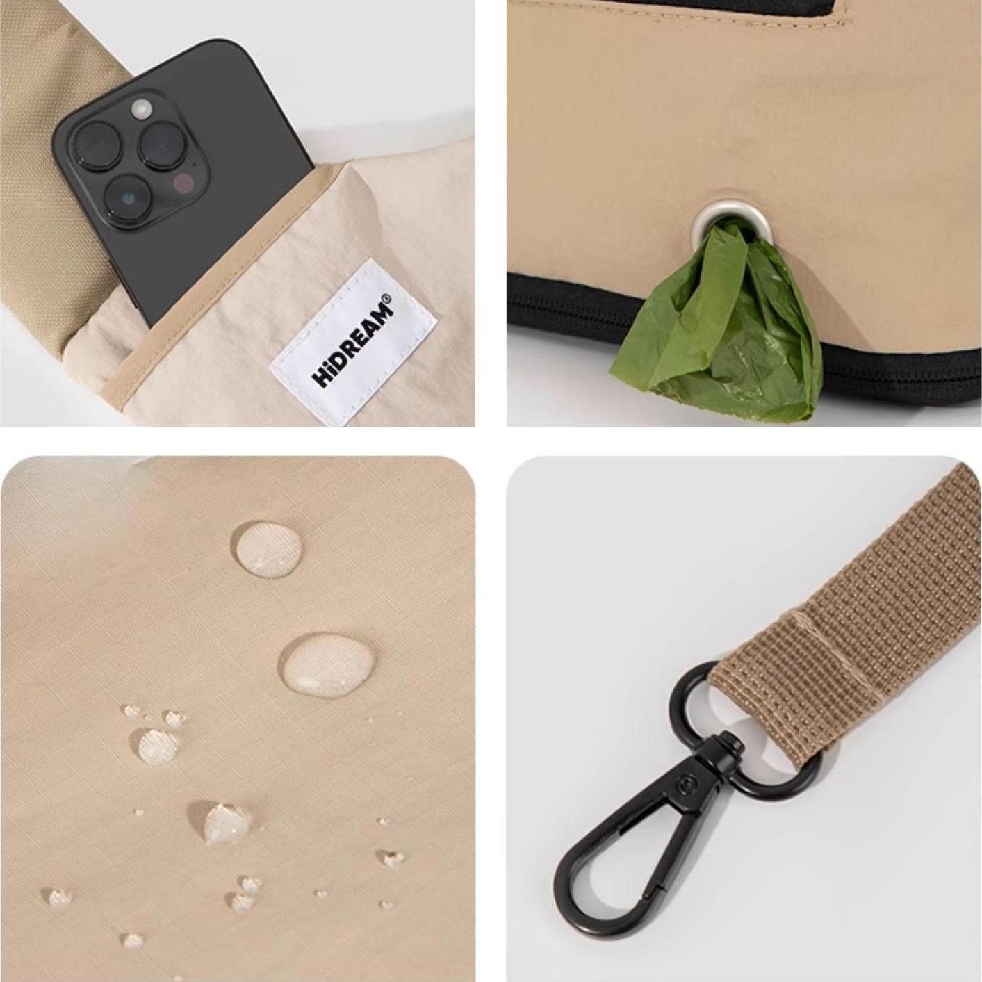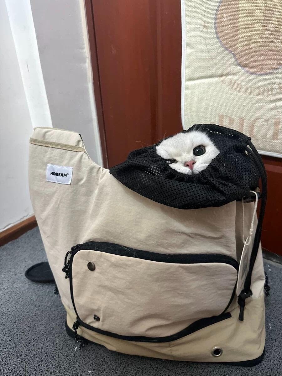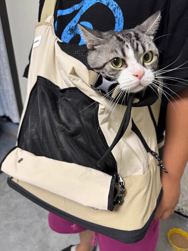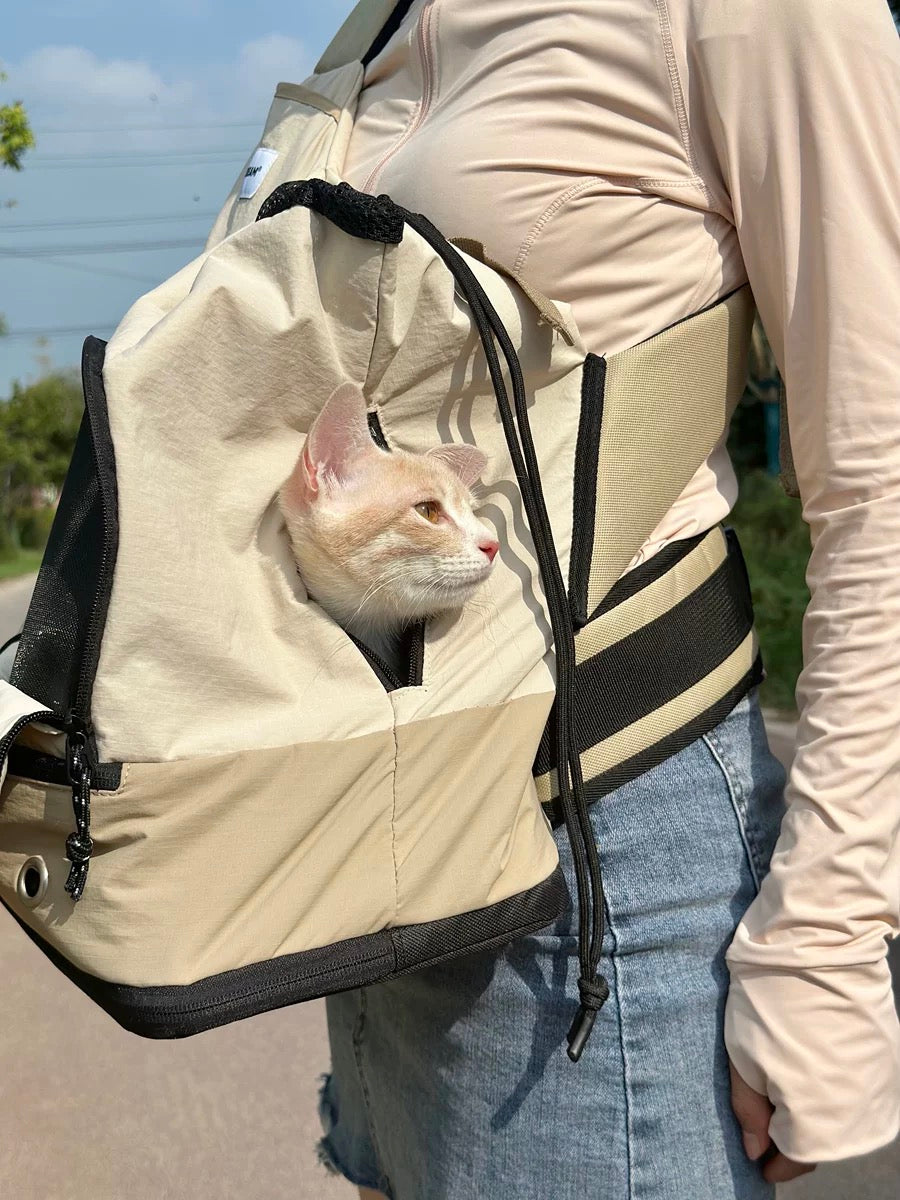 Made with water-resistant nylon fabric that repels cat fur and sweat for easy cleaning, this carrier features an escape-proof safety leash, side storage pockets, and a bottom compartment with a waste bag opening for secure item storage.