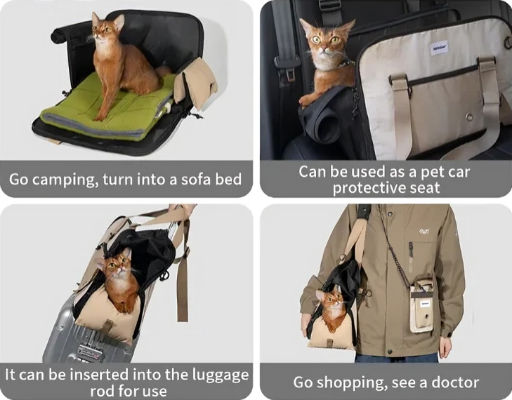 Perfect for travel, shopping, or vet visits—this versatile cat tote transforms into a comfy sofa bed, doubles as a car protective seat, and fits conveniently onto luggage handles.