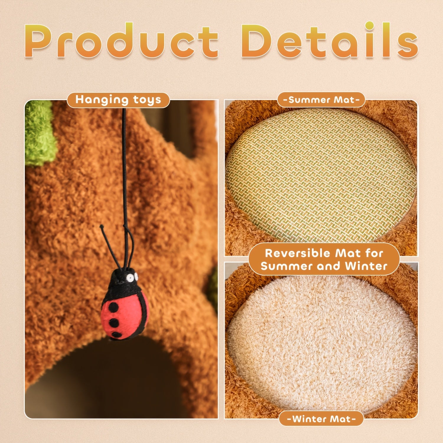 This cat bed features a reversible mat for summer cooling and winter warmth, plus a cute ladybug hanging toy for entertainment. Made with soft materials for a cozy, safe space.