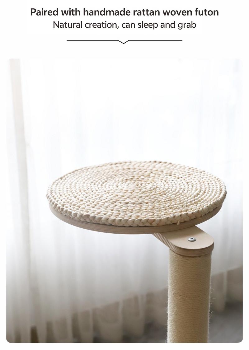 Enhance the setup with a handwoven rattan cat mat made from natural fibers, offering a soft yet scratch-friendly surface.