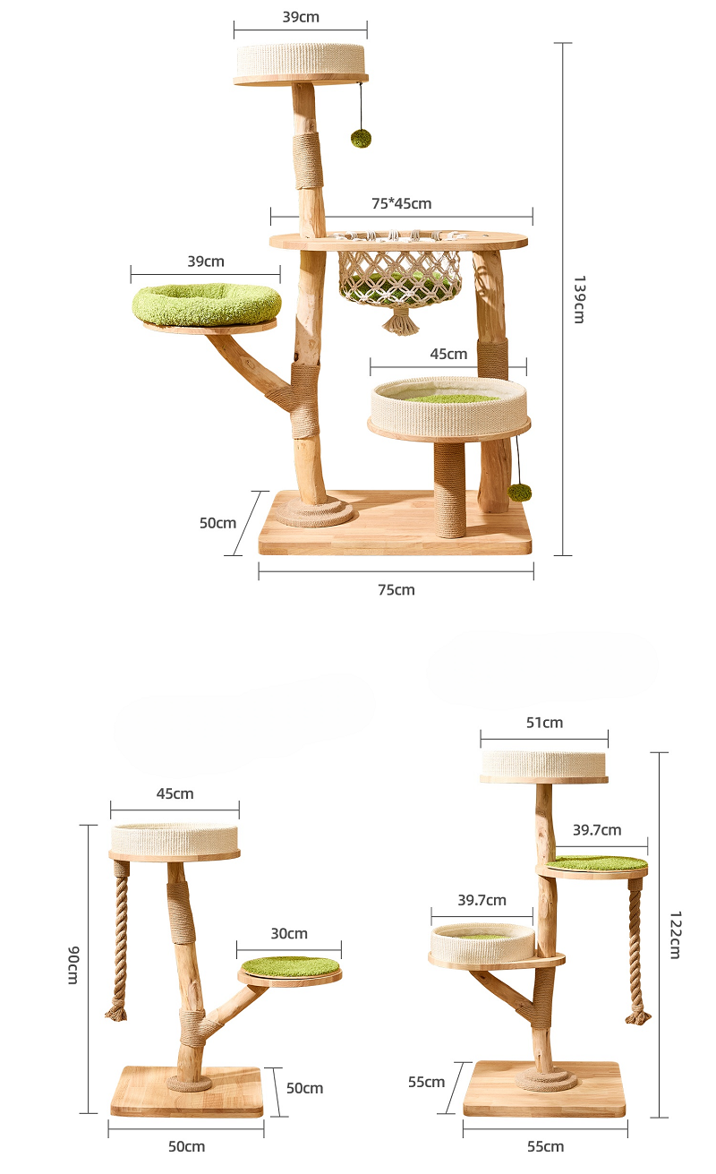 The wooden cat tree is made from high-quality engineered wood and natural fruitwood trunks. Reinforced base and scratch-resistant surfaces ensure long-term durability for daily use.